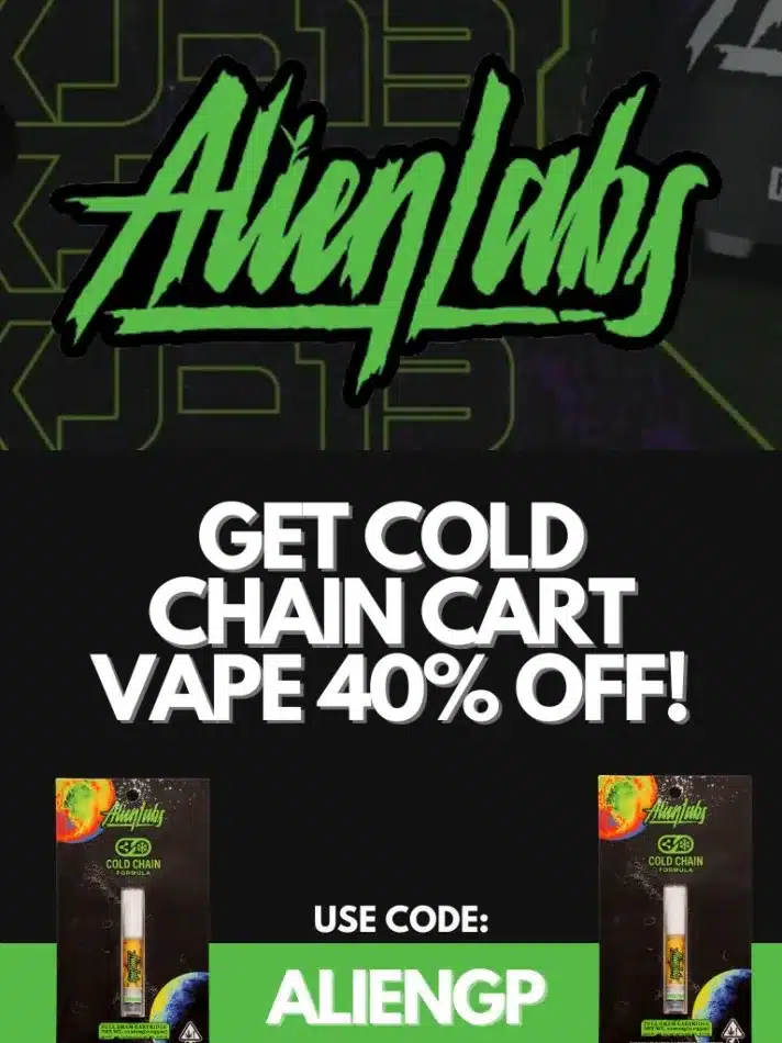 With the purchase of a qualifying Alien Labs 3.5g or 10g flower, you’ll get 40% OFF a Cold Chain 1g 510 cartridge — perfect for pairing flower + vape for the weekend lineup.