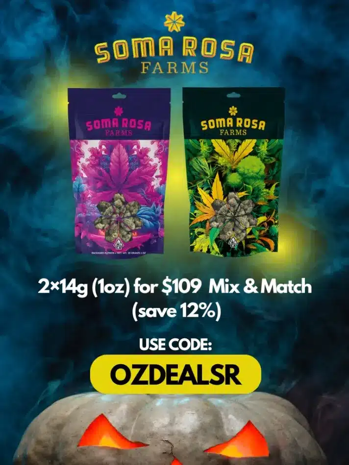 - Soma Rosa Sampler — 3x prerolls + 14g flower + 2x packs — $96 (was $111)
