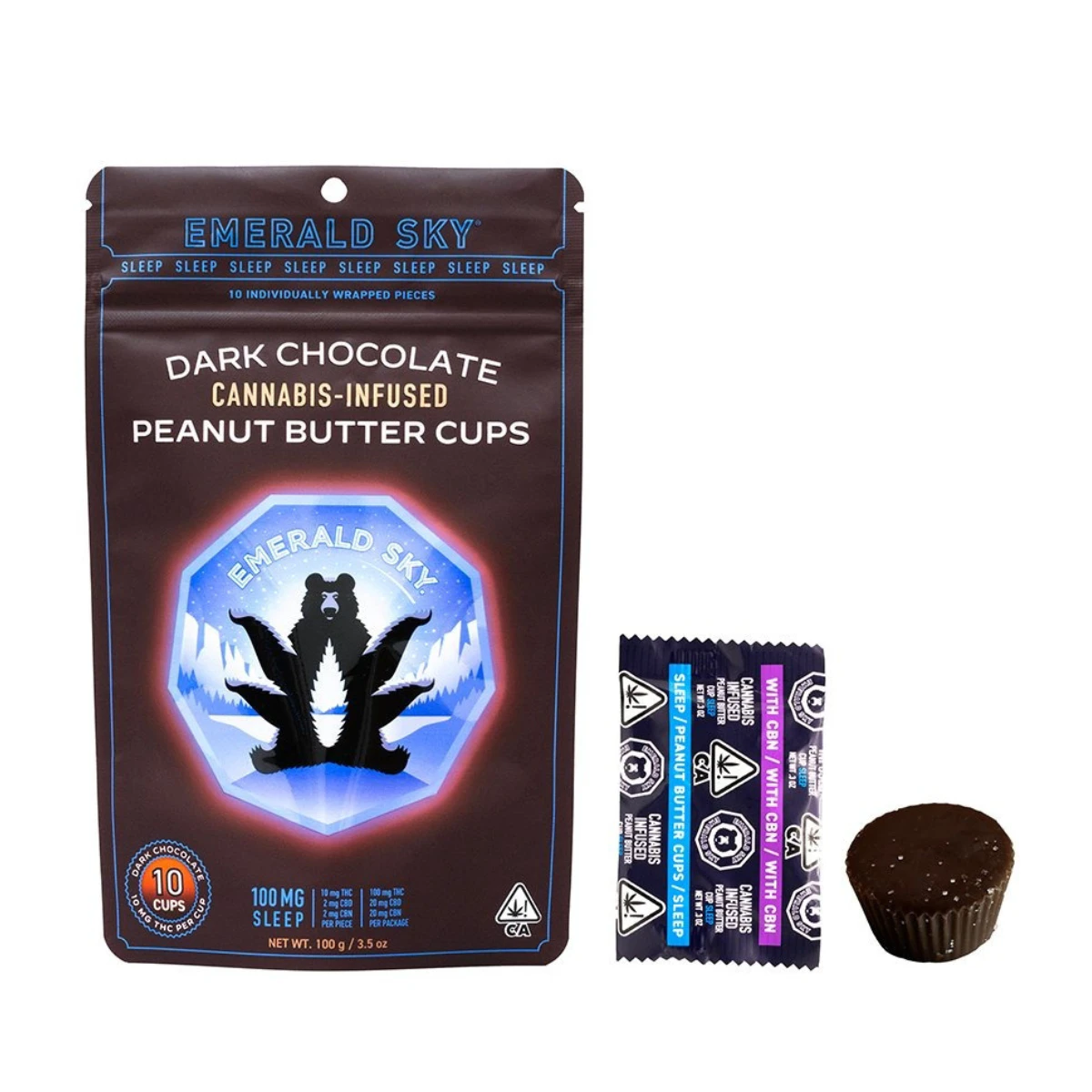 Peanut Butter Cups (Sleep) by Emerald Sky combine the deliciousness of milk chocolate and creamy peanut butter with a sleep-enhancing cannabis formula. Infused with 100mg THC per package, these cups are designed to help you unwind and prepare for a restful night’s sleep. This product focuses on THC, with no specific ratios of CBD, CBN, or THCv.