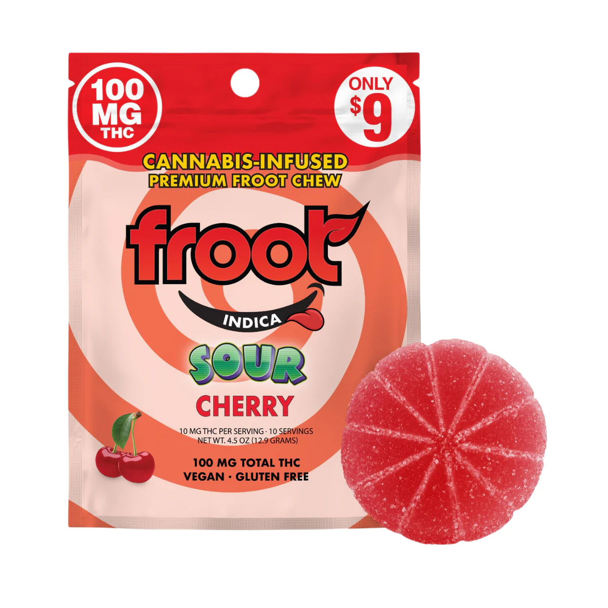 Dive into deep relaxation with FROOT’s Sour Cherry Gummies, an indica-infused edible crafted for flavorful relief and stress-free vibes. Each pack includes 10 tart yet sweet gummies, delivering a total of 100mg THC (10mg per piece). Whether you're winding down after a long day or prepping for restful sleep, these bold bites provide a mellow, body-calming experience.
