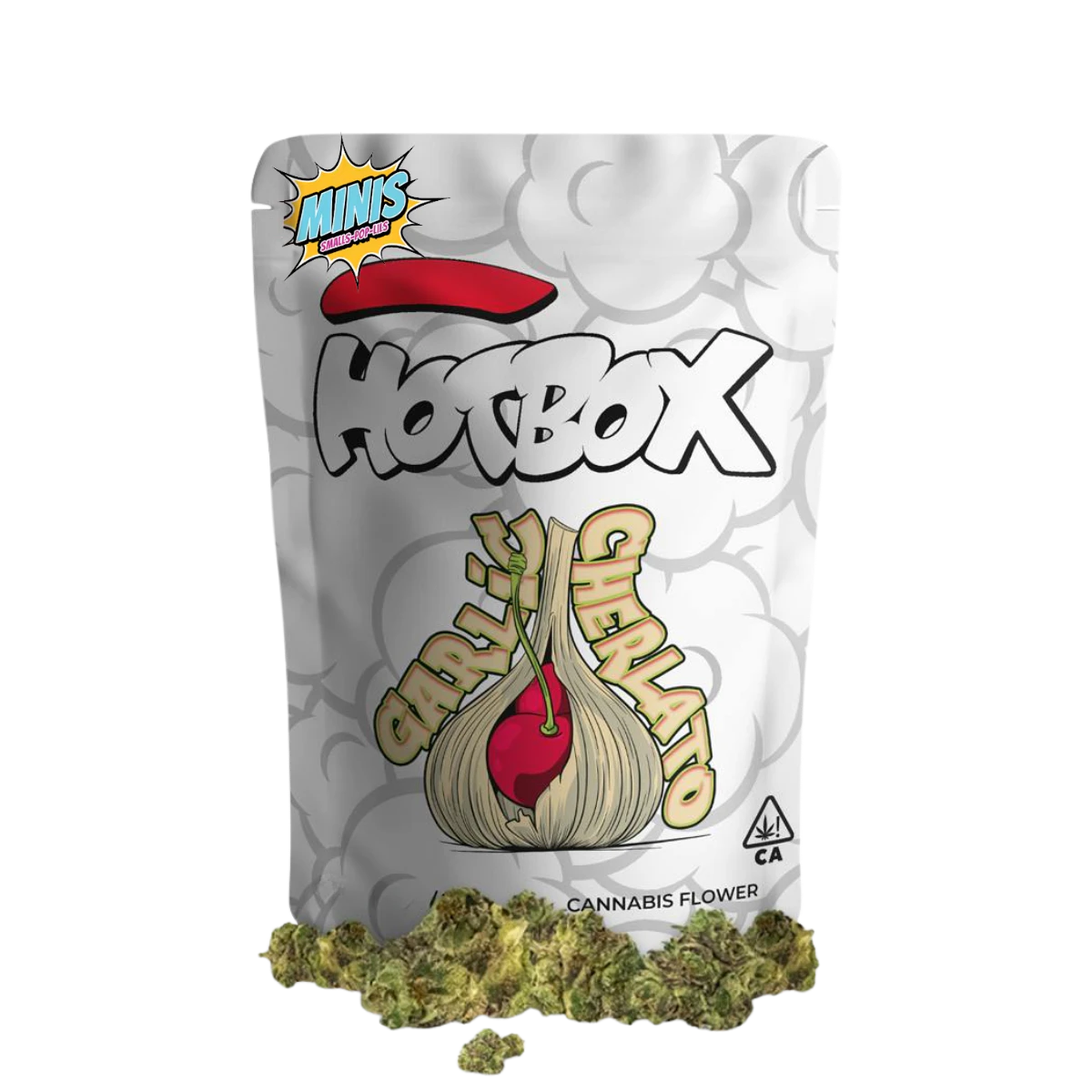 Hotbox Garlic Cherlato Indoor Minis is a mellow, indica-leaning strain crafted from GMO × Lemon Cherry Gelato—built for customers who want a flavorful unwind without getting completely knocked out. Expect bright olive-green buds with purple flecks and sparkling amber trichomes, giving these minis that frosty, top-shelf look in a convenient 7g format.
