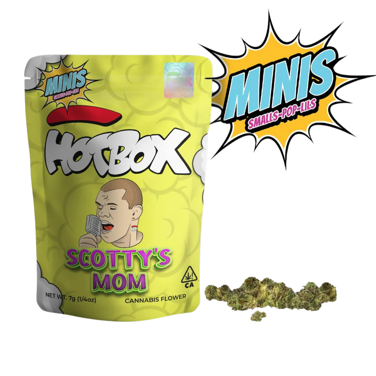 HOTBOX’s Scotty’s Mom now in a convenient 7g indoor minis format—hand-selected small buds from premium indoor lots, slow-cured for smooth, even burns and max dessert-kush terps. Expect dense, frosty nugs that grind fluffy and roll easily, delivering cozy, body-heavy indica effects perfect for evening unwinds and mellow weekends.