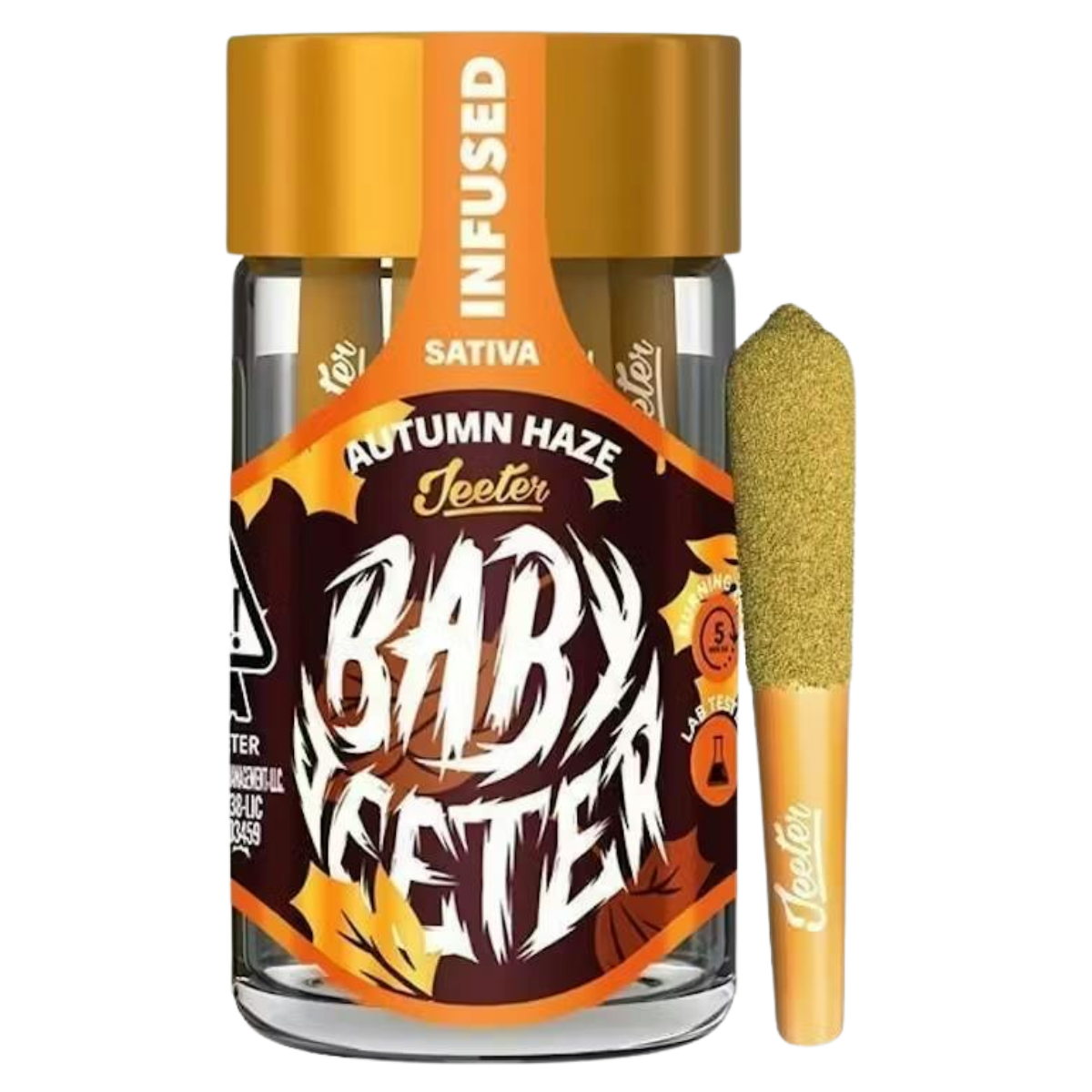 Autumn Haze .5g 5pk Infused Baby Jeeters by Jeeter deliver a premium smoking experience in a convenient pack of five. Each preroll is crafted with high-quality indoor sativa flower, infused with potent live resin for elevated flavor and effects, then dusted in kief for an extra kick. Expertly rolled to ensure an even burn, these prerolls are perfect for those who want a smooth, flavorful, and powerful sesh on the go.