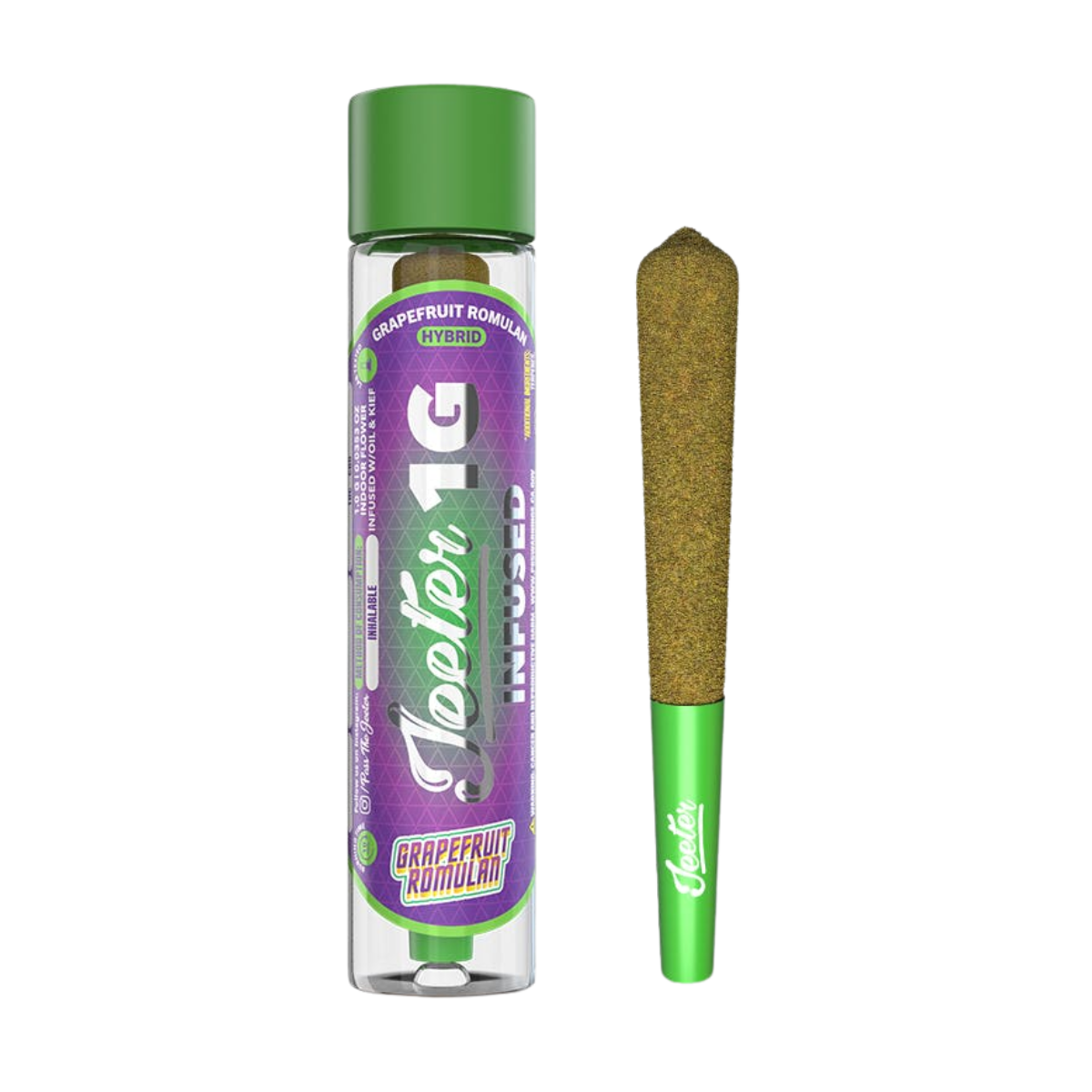 The Grapefruit Romulan Infused Preroll by Jeeter features a perfectly balanced hybrid experience in a 1g format. Made with premium indoor flower infused with live resin and coated with kief, this preroll offers a smooth and flavorful smoke. Expertly rolled to ensure an even burn, it's ideal for a robust and energizing hybrid high.