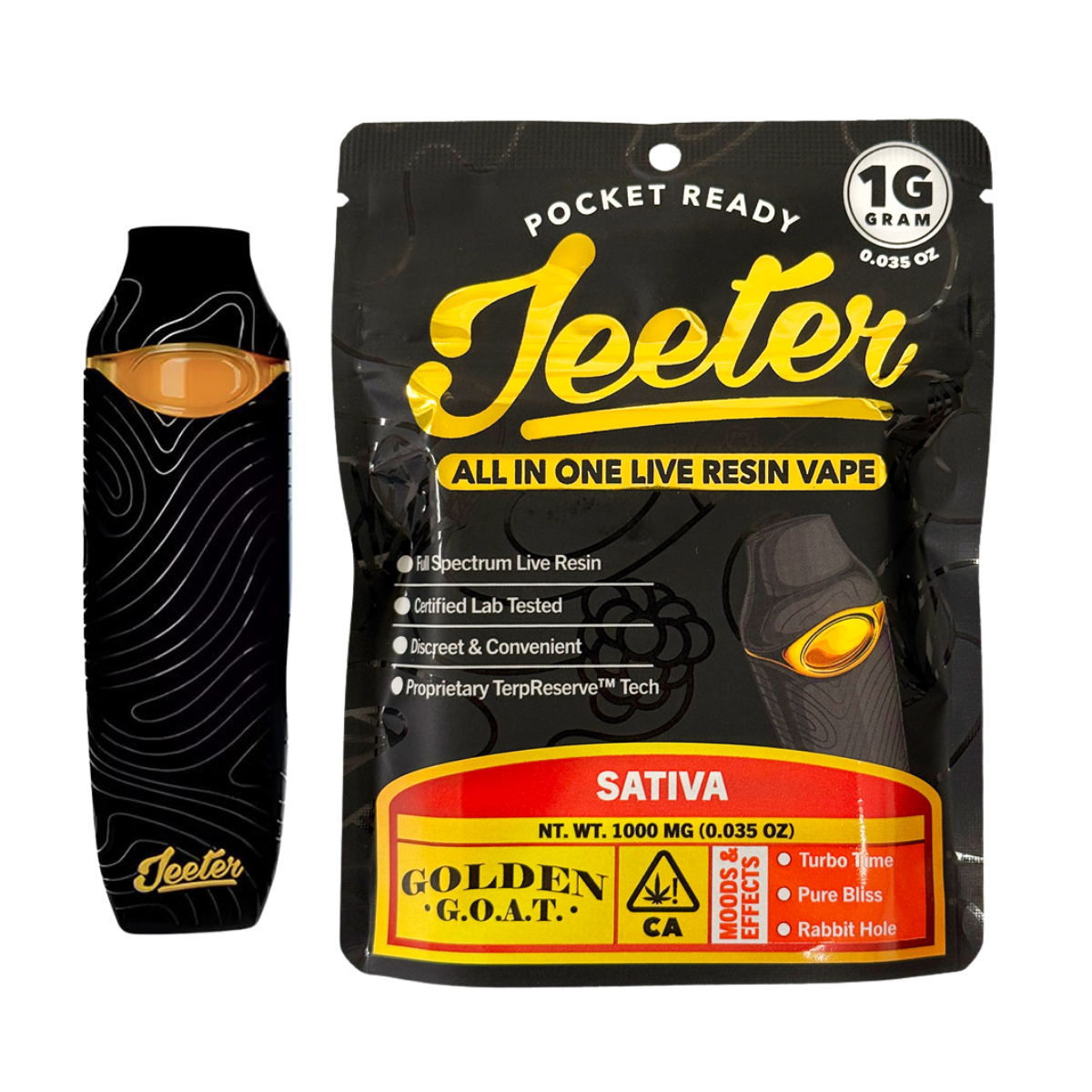 Jeeter Golden G.O.A.T. Live Resin AIO is a bright, full-spectrum sativa-dominant hybrid vape crafted from fresh frozen flower for a louder, more true-to-strain experience. Jeeter’s live resin process preserves the plant’s natural terpene and cannabinoid profile, giving you a flavorful, flower-like session in a convenient 1g all-in-one format.