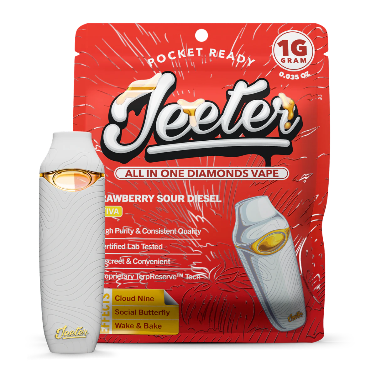 Jeeter Strawberry Sour Diesel Liquid Diamonds AIO is a bright, punchy sativa vape built for customers who want serious flavor with an energetic, on-the-go vibe. This all-in-one device pairs the legacy genetics of Sour Diesel × Strawberry Cough, creating a fruit-forward profile with a sharp gas backbone that hits loud from the very first pull.