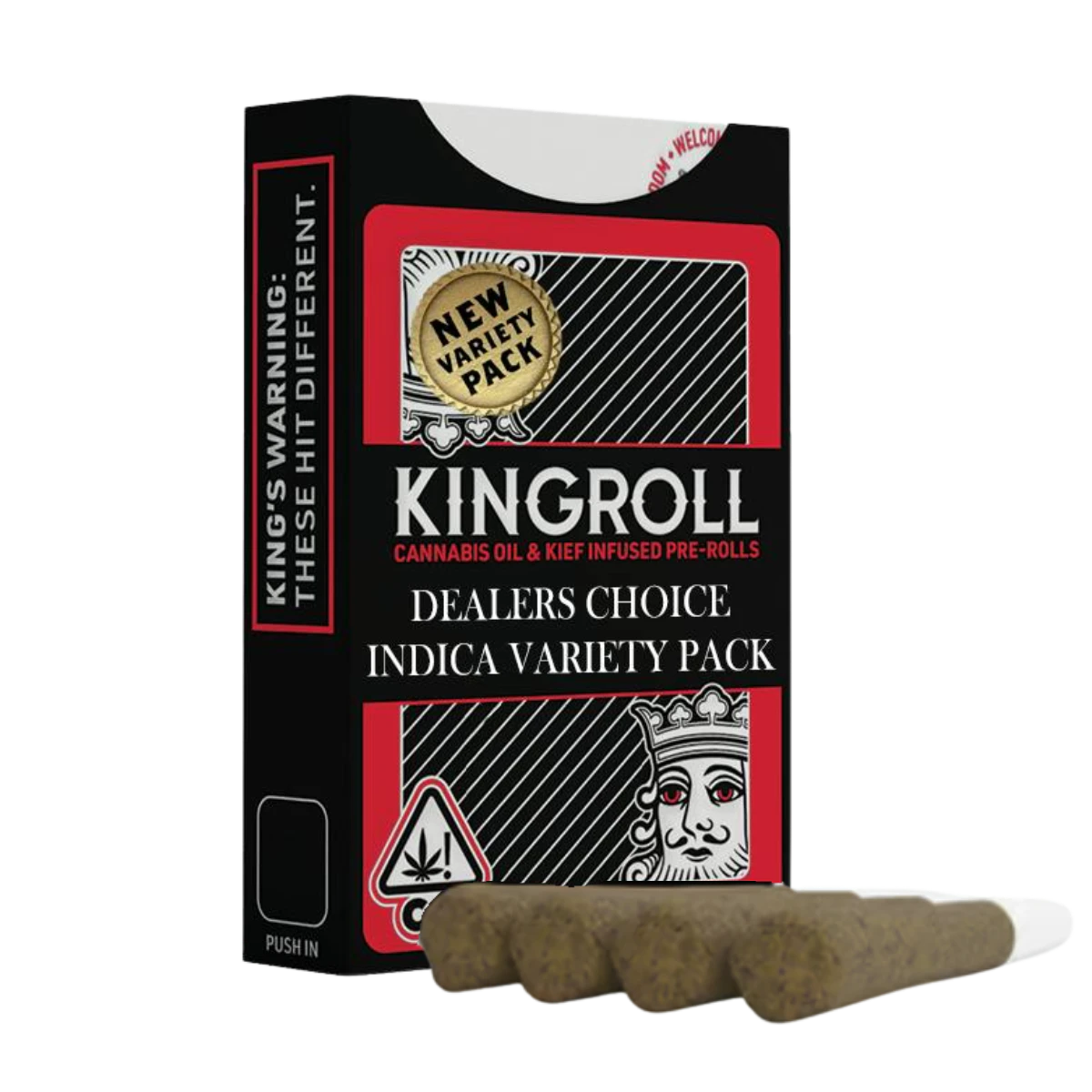 Kingroll’s Dealers Choice Indica Mixed Pack #6 offers four uniquely crafted .75g infused prerolls, each featuring high-quality indoor flower infused with potent cannabis oil for an enhanced smoking experience. These prerolls are designed for a slow, smooth burn, allowing users to fully enjoy the rich terpene profiles and heavy-hitting indica effects. No kief dusting, just premium infusion to elevate potency and flavor.