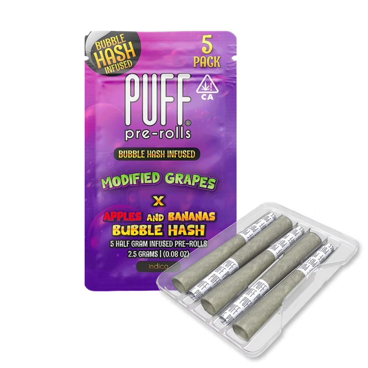 Puff x West Coast Treez x LBS Bubble Hash Prerolls blend premium Modified Grapes flower with rich, full-melt Apples & Bananas Bubble Hash to create a deeply flavorful, powerfully calming infused preroll. Each .5g preroll burns smooth and slow, delivering a potent hash-boosted experience with no harshness—just pure terpene expression and settled indica comfort.
