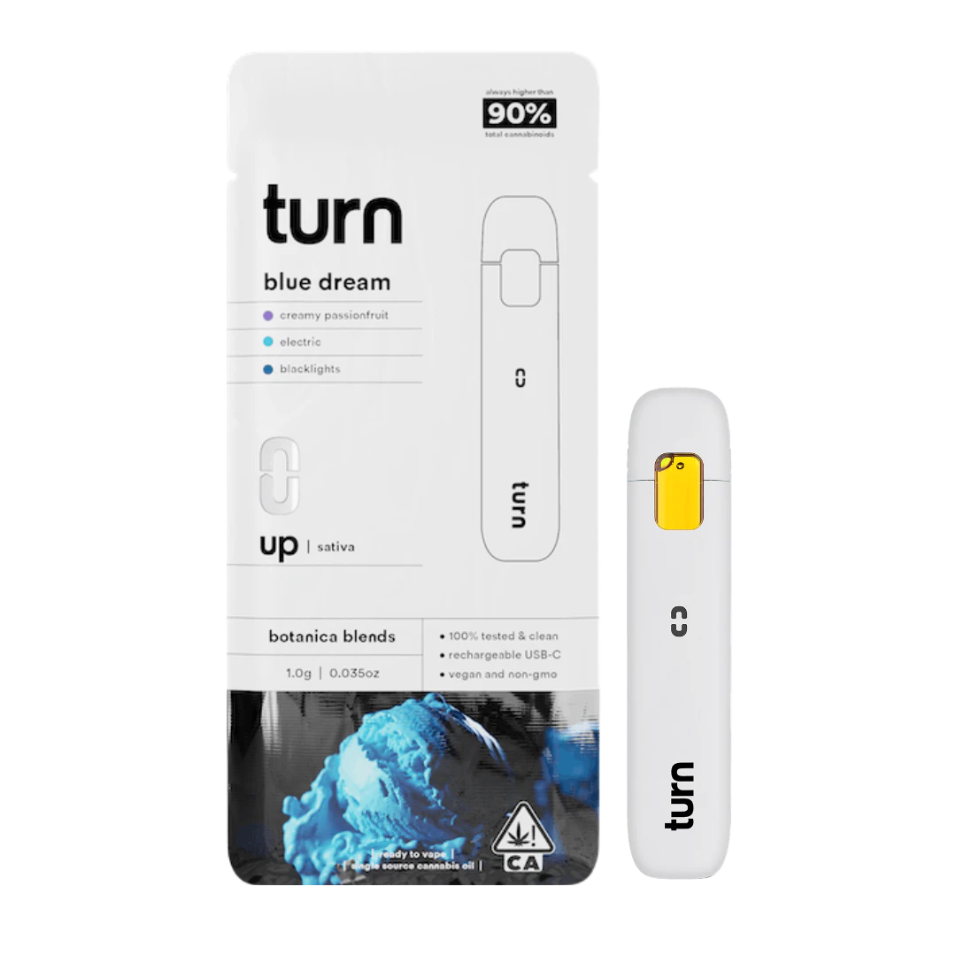 Blue Dream 1g Botanica Blends AIO by Turn is a smooth, sativa-inspired vape that blends botanical terpenes with high-potency THC oil in a convenient all-in-one device. This fruity and herbal pen offers a balanced experience, delivering flavorful vapor with no need for a separate battery.