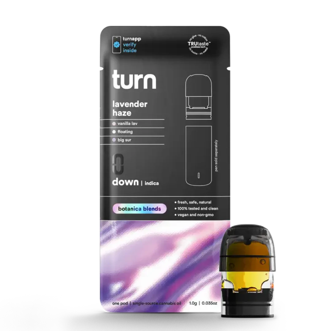 Lavender Haze 1g Botanica Blends Pod by Turn is a premium indica vape infused with a custom botanical terpene profile that mimics the soothing essence of the classic Lavender strain. Designed for use with Turn’s proprietary pod system, this cartridge provides a flavorful, aromatic session that promotes relaxation and ease with every inhale.
