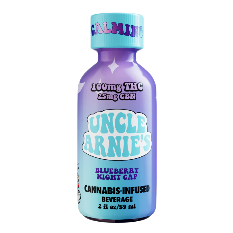 Unwind with Uncle Arnie’s Blueberry Night Cap, a 2oz cannabis shot crafted with a 4:1 THC:CBN ratio for restful, restorative sleep. Infused with the rich flavor of wild blueberries, this bedtime blend delivers a smooth balance of 100mg THC and calming CBN to help quiet the mind and relax the body.