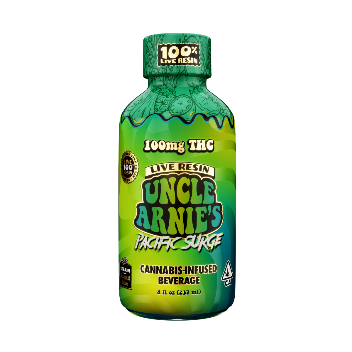 Pacific Surge is Uncle Arnie’s bold live resin-infused hybrid beverage, delivering a full 100 mg of THC in a delightfully tropical citrus drink. Crafted using solventless live resin, it retains the natural terpene profile of fresh flower for richer aroma and more nuanced effects—ideal for those seeking a flavorful, uplifting experience that’s smoother and more authentic than distillate-based drinks