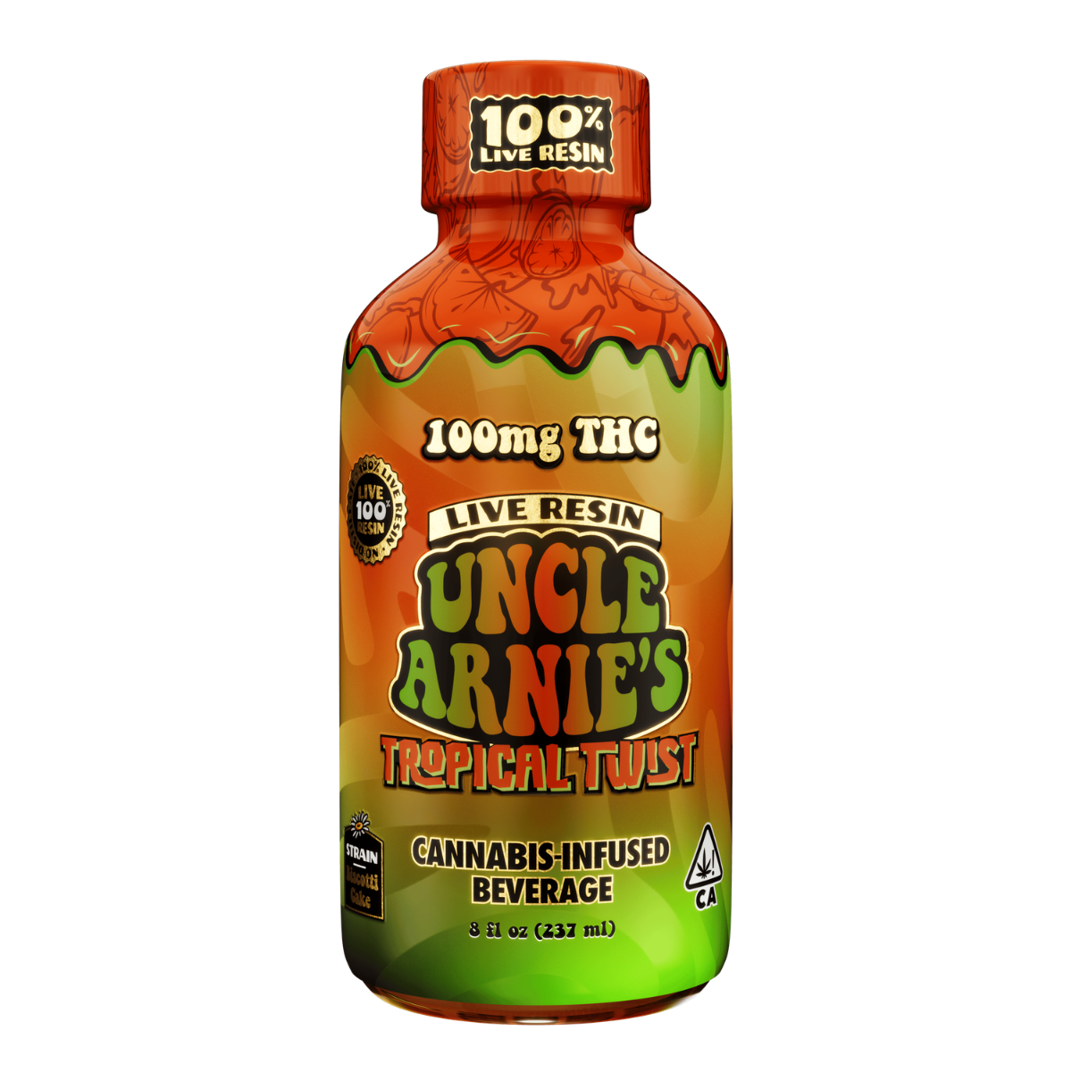 Uncle Arnie’s Tropical Twist is a hybrid live resin beverage packed with 100 mg THC in an 8 oz bottle. Crafted using nanomolecular technology and real live resin, this drink delivers a vibrant, flavorful experience with quicker onset (around 20–40 minutes) compared to distillate beverages. Live resin preserves the full terpene profile, enhancing effects and taste. Perfect for those seeking a balanced, uplifting, and flavorful infusion. :contentReference[oaicite:0]{index=0}