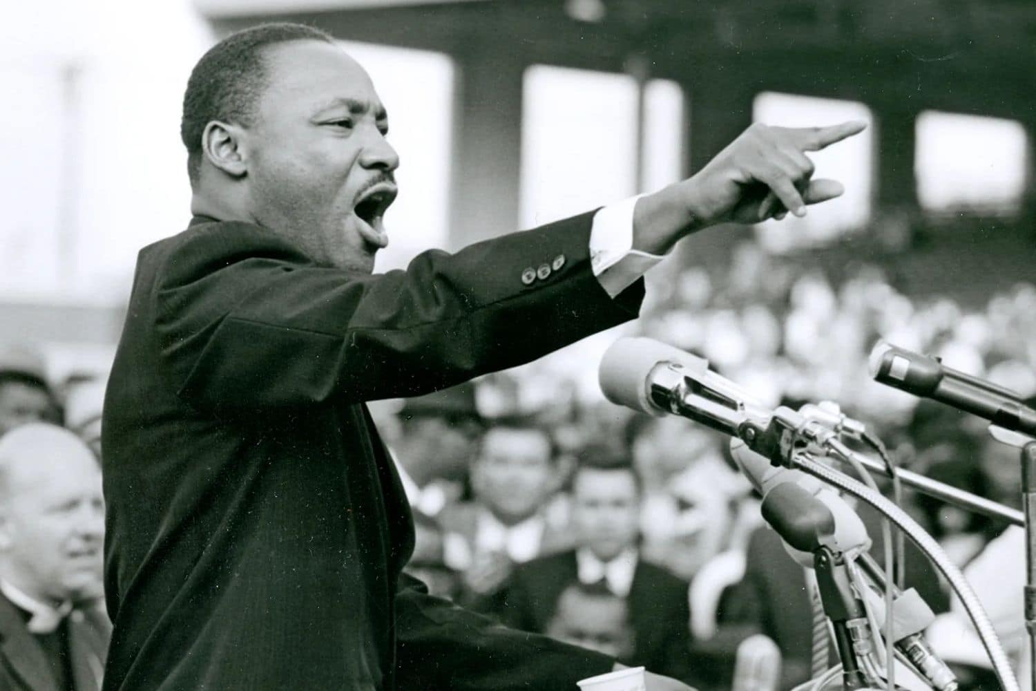 Black and white historical photo of a civil rights leader speaking passionately at a podium during a large public gathering, symbolizing justice, equality, and unity on MLK Day.